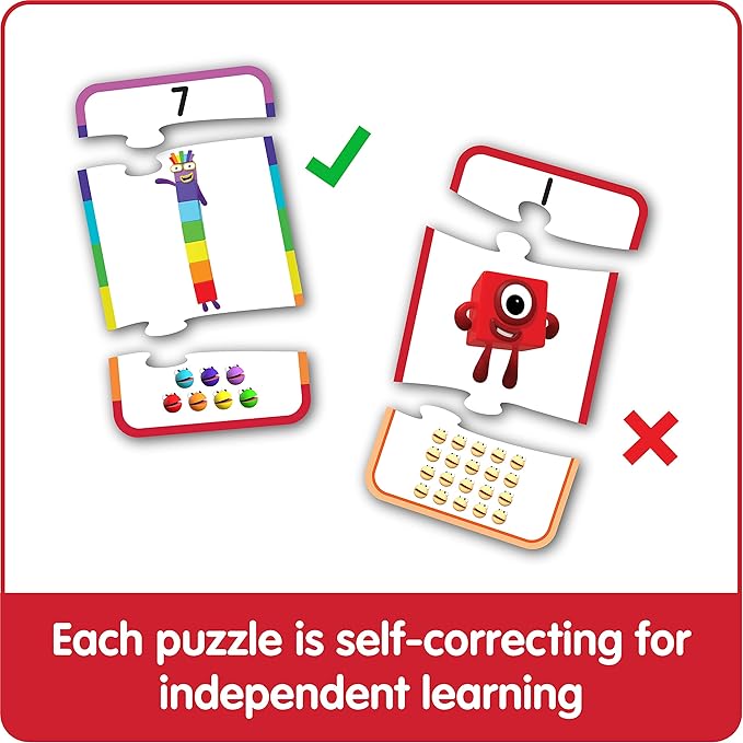 - PRESCHOOL MATH LEARNING TOY: Each set includes 20 self-correcting puzzles featuring Numberblocks One to Twenty. Puzzles measure 6” x 4”.