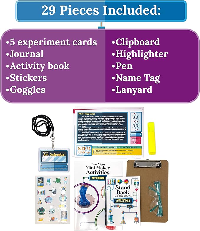 - What’s Included: This 29-piece set features everything your child needs to take on fun STEM learning activities, including 5 experiment cards, a journal, activity book, stickers, goggles, a clipboard, highlighter, pen, a name tag, and a lanyard.