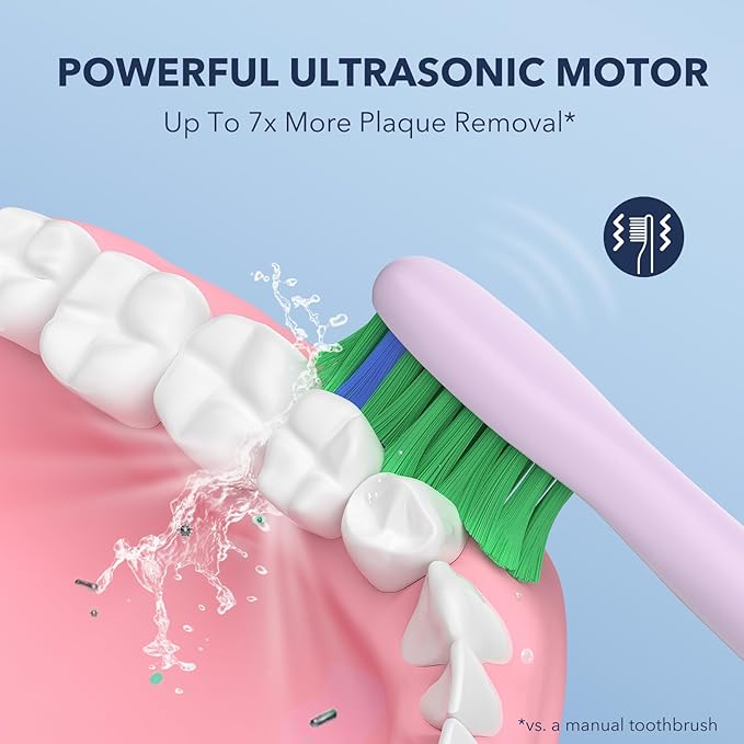 - 【Powerful Sonic Cleaning & 2-Mins Timer】--- Recommended by professional dentists --- [1] Ultrasonic toothbrush packed with the most up to date sonic technology for exceptional clean and remove up 7X plaques. It features a industry leading motor producing 40,000 vibrations per minute, can reach deep areas in the mouth that traditional toothbrushes may miss. [2] Built in smart timer control, 30 seconds interval reminding you to move to the next quadrant of your mouth, and totally in 2 minutes.