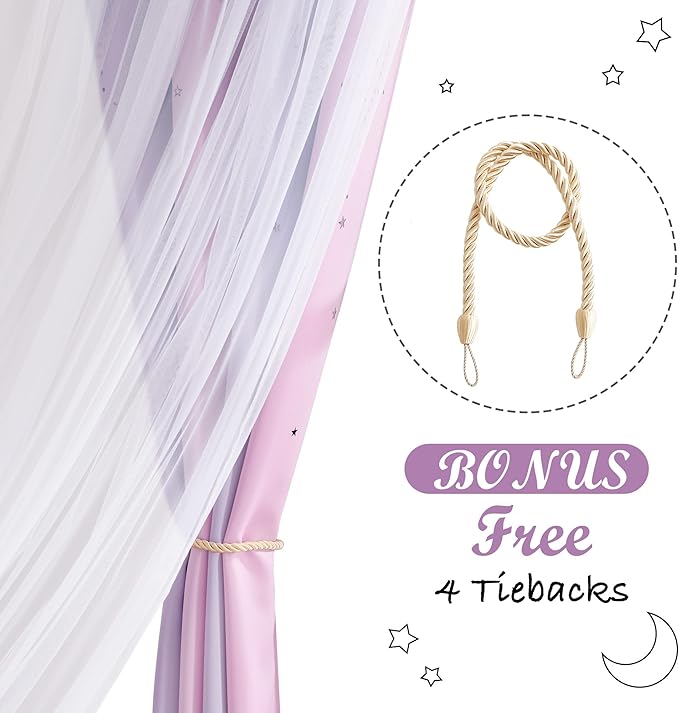 NICETOWN Moon Star Curtains for Girls Bedroom Nursery Blackout Decor Light Blocking Sheer Overlay PrincessRainbow Striped Layered Window Curtains, 2 Panels, 52W x 84L, Purple Blue Pink