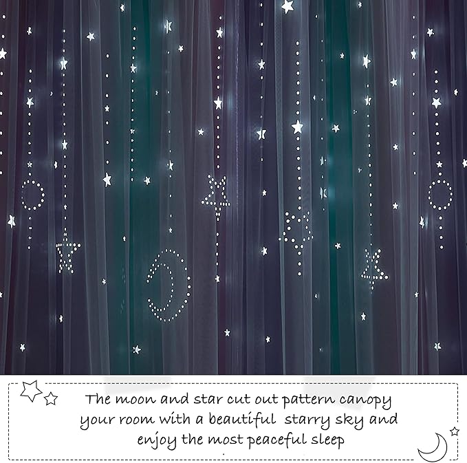 - Hollow Star: Hollow stars design cuts the light entering the room into the star shapes. The stars twinkle with the changing light throughout the day. This special airy sheer design will create a more dreamy sense for your little kids' room.