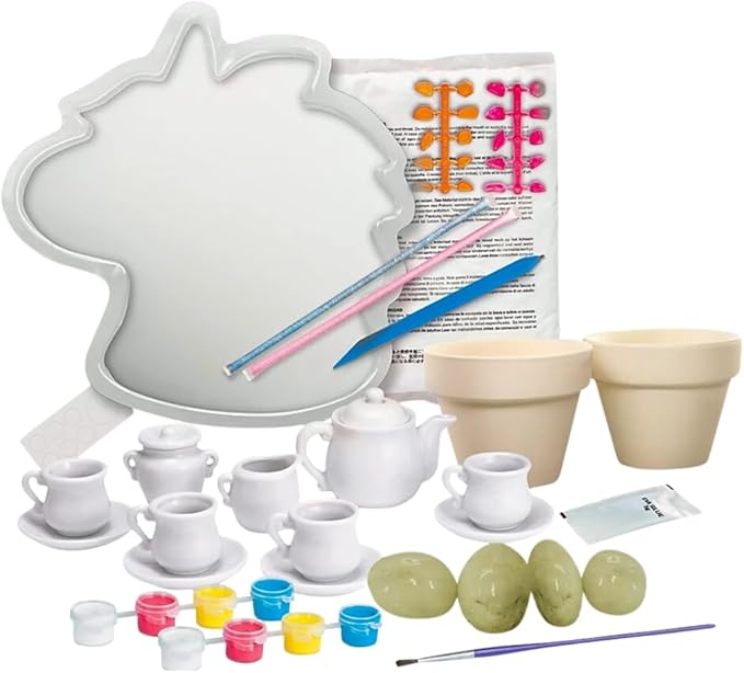 - This set contains -13-piece porcelain mini tea set, 4 smooth stones, 2 terracotta flower pots, 2 paint strips, 1 paintbrush, 1 bag of plaster powder, 1 unicorn blister mould, 1 large gem stone, 6 small gem stones in 2 colours, 1 carving tool, 1 glow-in-the-dark star, as assortment of plastic mosaic pieces, 2 coloured sand straws, 1 bag of EVA glue, 1 transparent sticker