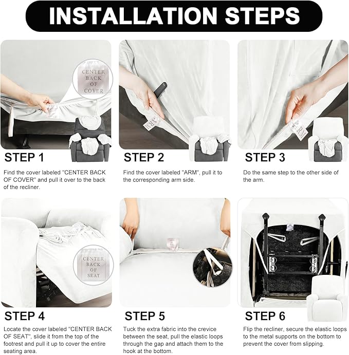 - Stay in Place: Durable elastic hem is well-sewn at the bottom of the recliner cover, making it holds the seat tight. Thick elastic loops can be hooked and secured under the footrest or metal bracket at the bottom, which can prevent slipping. The separated design helps every part of the furniture stays tighter while reflecting the original shape, recommended for both leather and cloth furniture.
