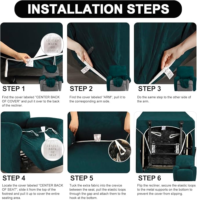 - Stay in Place: Durable elastic hem is well-sewn at the bottom of the recliner cover, making it holds the seat tight. Thick elastic loops can be hooked and secured under the footrest or metal bracket at the bottom, which can prevent slipping. The separated design helps every part of the furniture stays tighter while reflecting the original shape, recommended for both leather and cloth furniture.