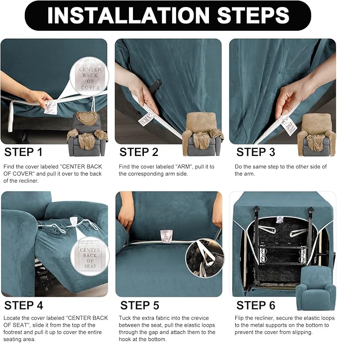 - Stay in Place: Durable elastic hem is well-sewn at the bottom of the recliner cover, making it holds the seat tight. Thick elastic loops can be hooked and secured under the footrest or metal bracket at the bottom, which can prevent slipping. The separated design helps every part of the furniture stays tighter while reflecting the original shape, recommended for both leather and cloth furniture.