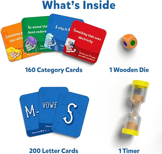 - INCLUDES: 160 Category Cards, 200 Letter Cards, 1 Wooden Die, 1 Timer & Instruction Manual