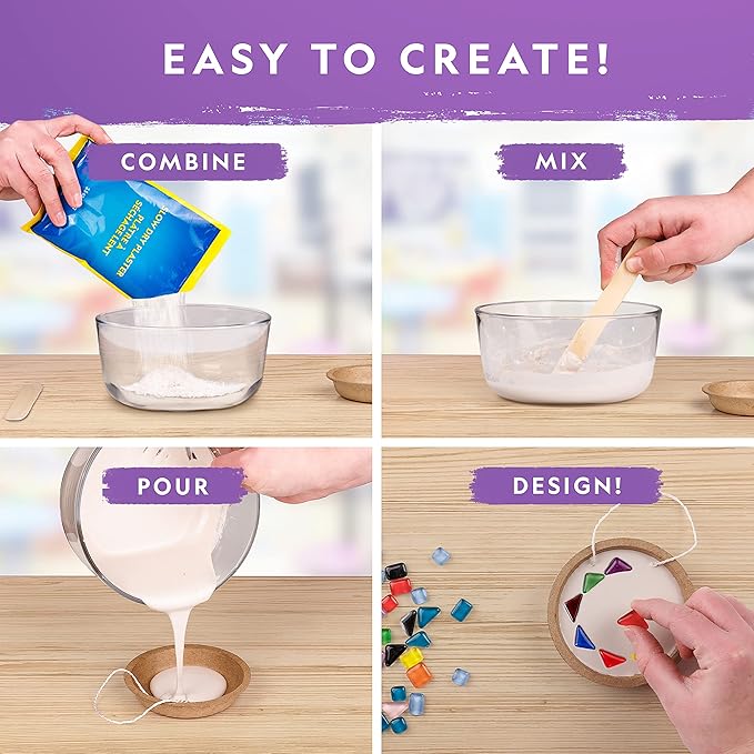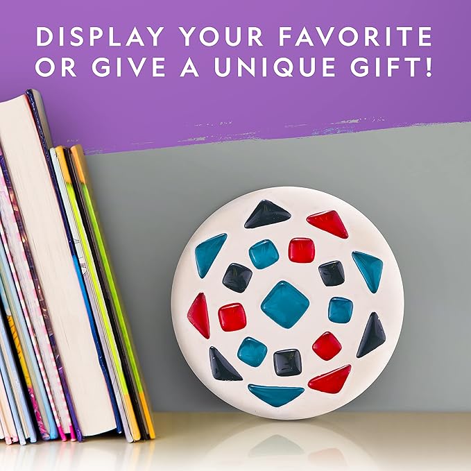 - EVERYTHING INCLUDED - This mosaic art kit includes everything needed to create 3 mosaics: 3 bags of slow-dry plaster, 3 reusable waterproof molds, assorted glass tiles, wooden stir stick, hanging cord, Learning Guide & kid-friendly instructions.