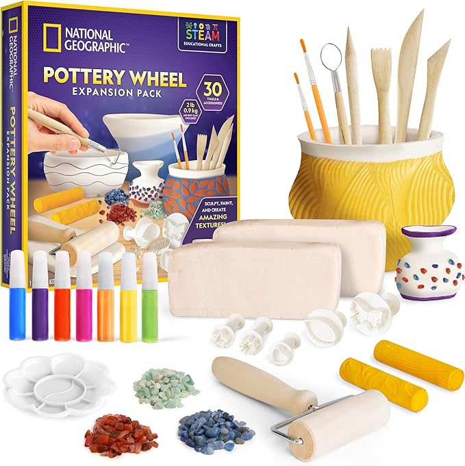 - 30 POTTERY TOOLS & ACCESSORIES - Get more from your National Geographic Pottery Wheel with this expansion set! Includes 2 lbs. of air-dry clay along with 30 pottery-making tools & accessories, from paints & gems to wooden sculpting tools & more!