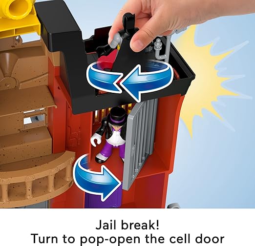 - Playset features multiple Super-Villain secret lairs, a bank vault that opens, working elevators, pop-up green 'flames' and a jail cell