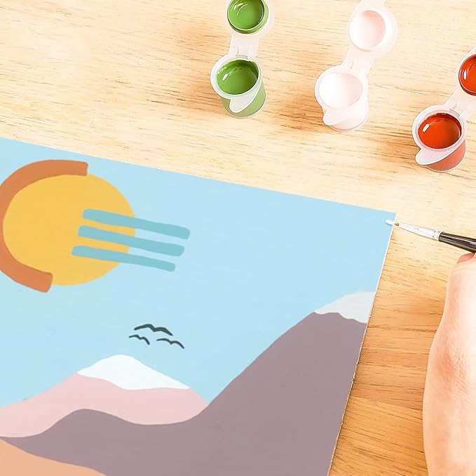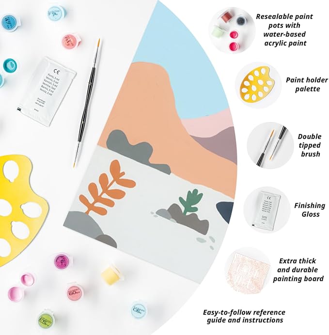 - Everything Included: Water-based acrylic paints in resealable pots, 1 packet of finishing gloss, 1 double-tipped brush, 2 paint holder palettes,1 cardboard canvas, 1 painting reference guide, 1 set of simple instructions, and 1 picture hanger.
