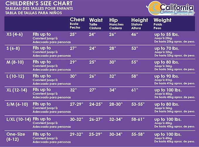 - Child Medium (8-10): Chest 29", Waist 25", Hips 30", Height 55", Up to 80 LBS.