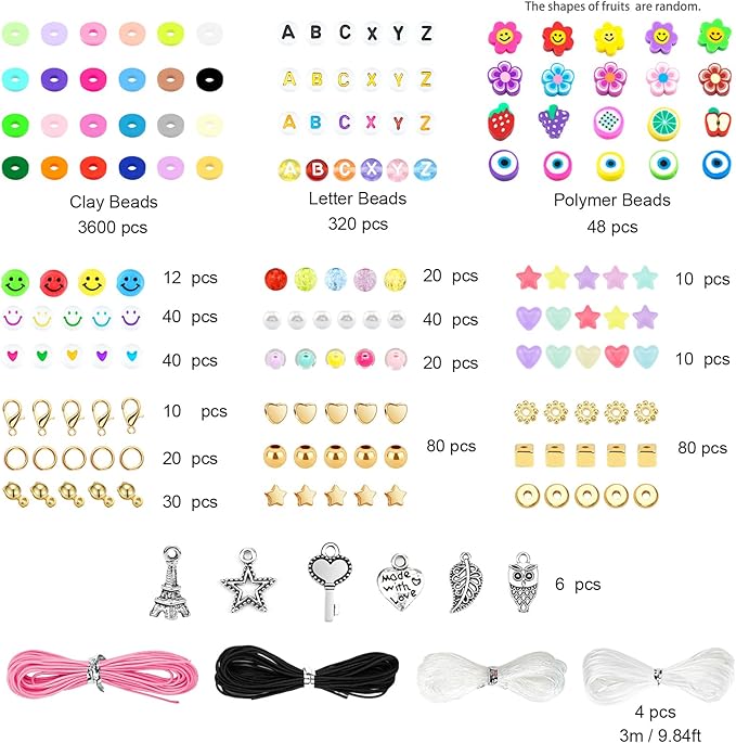 - Everything you need is included: Two boxes contain about 3600pcs clay beads in 24 vibrant colors, about 48pcs polymer clay beads in 4 types,320pcs random letter beads in 4 types,20pcs plastic smile beads and 100pcs small round beads,166pcs charms kit.2 rolls of 6 meters of elastic strings. You can make bracelets or jewelry according to your favorite color and style.