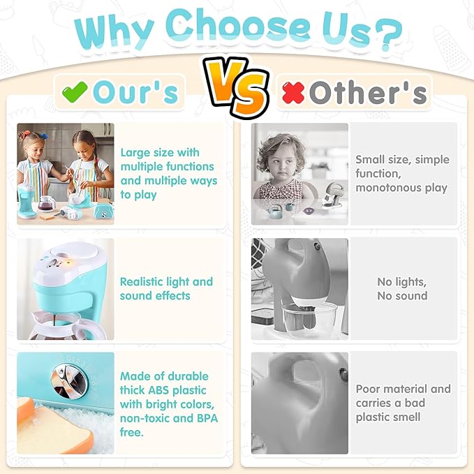 - High-fidelity play kitchen accessories for kids:cocinas de niñas including a pretend toy coffee maker for kids, a toy mixer, and a toy toaster, which can be used to accompany children to spend a happy parent-child time, guide children to make afternoon tea by themselves, and your children can make Coffee and make delicious cookies with you. improve children's hands-on ability, and cultivate children's interest.
