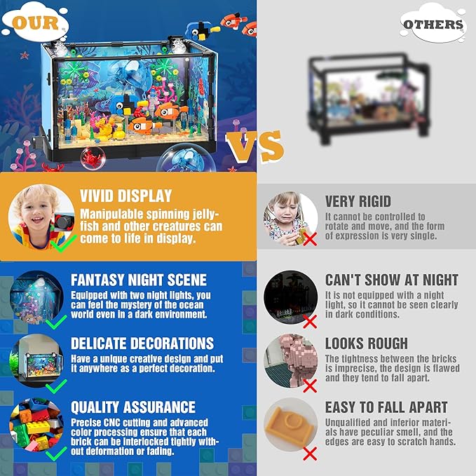 - Fantastic Night Scene: This Aquarium building block is equipped with two night lights, allowing you to feel the mysterious atmosphere of the ocean world even in a dark environment. In addition, the detachable background plate for the fish tank and the steerable rotating jellyfish can show different scenes, which is a perfect table ornaments.