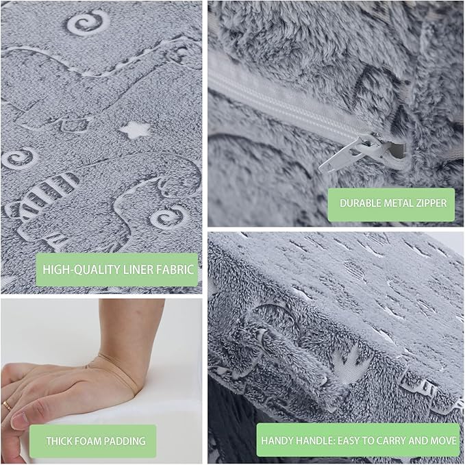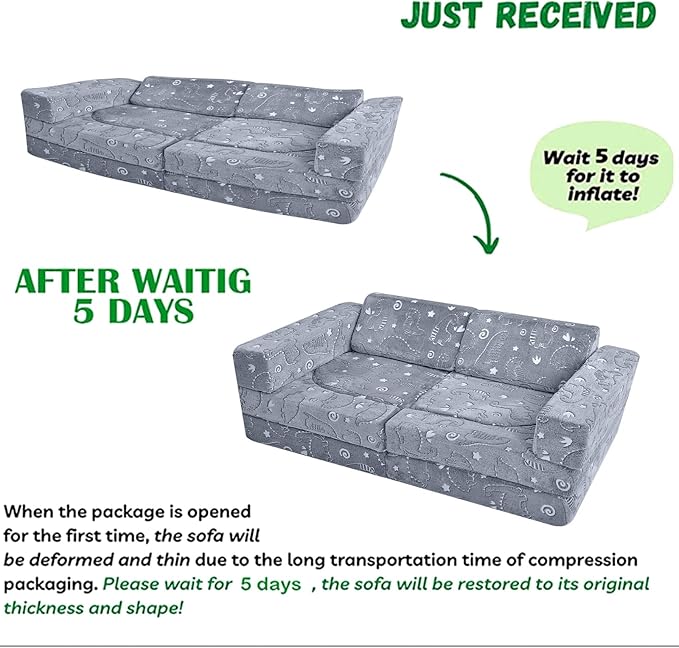 - [Let It Inflate 3-5 Days] Upon opening, the kids’ foam couch may appear thin due to compression. Open all zippers and wait 3-5 days for it to regain original shape. For quicker results, use a garment steamer to restore foam height and remove wrinkles