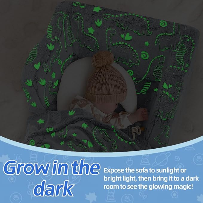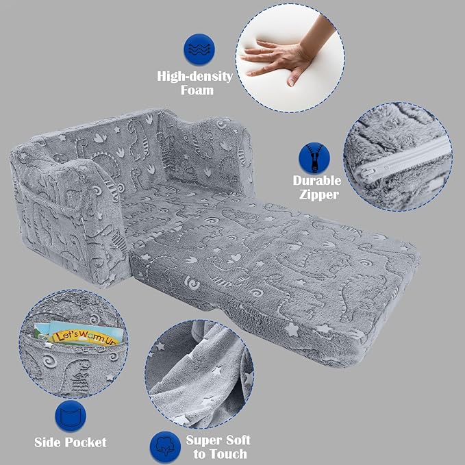 MeMoreCool Kids Dinosaur Couch, Foldable Toddler Chair, Glow in The Dark Convertible Sofa Bed, Fold Out Lounge for Boys Ages 1-3 in Playroom, Comfy Recliner Lounger (Grey)
