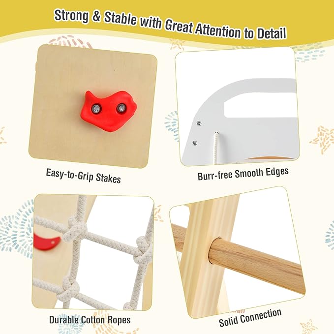 - 【Play Safer with 100% Natural Materials!】 The wooden indoor jungle gym uses 100% natural industrial grade wood as materials as the slide boards are made of birch wood while the round rods are made of beech wood, both of which are characterized by great durability. The surface is coated with a Non-toxic BPA free which is more environmentally friendly than plastic materials, thus creating a safe environment for your kids when playing. NOTE: Parents must supervise children while playing.