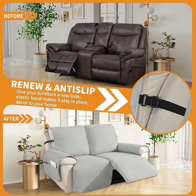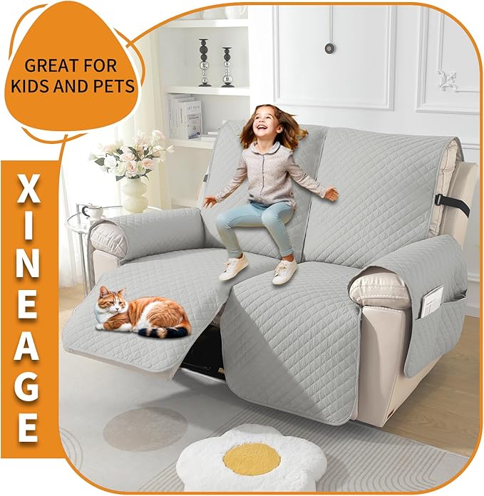 XINEAGE Water Resistant Recliner Cover, 2 seat Recliner Loveseat Covers with Pockets, Quilted Thick Recliner Protector Cover for Dog Pets with Non Slip Backing and Strap(Recliner Loveseat,Light Gray)