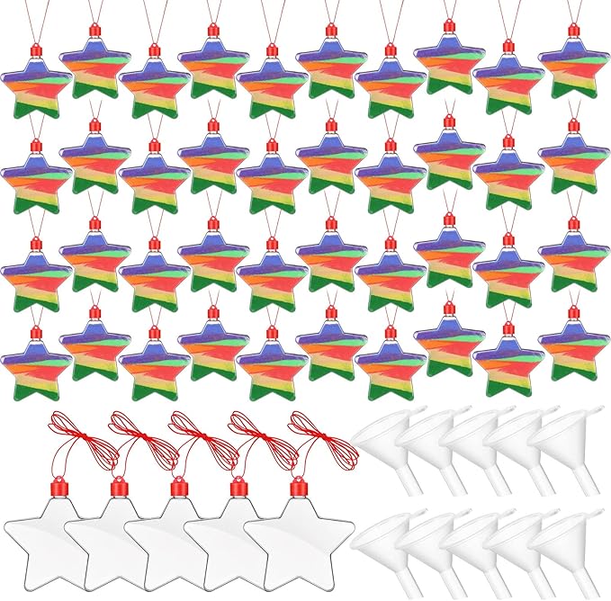 - Sand Art Set: you will get 50 pieces of star shaped sand bottle necklaces with 50 pieces of red ropes and 10 pieces of mini funnels, nice combinations can make crafts easy and impress anyone; Note: the colored sand is not included