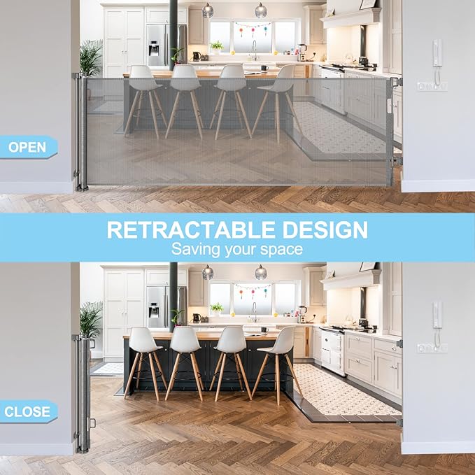 - Retractable Gate-Saving Your Space: The extra wide retractable baby gates are retractable, the mesh can be rolled up when not in use, not taking up your space, and when there is a party in the house, easy for your friends to pass through.