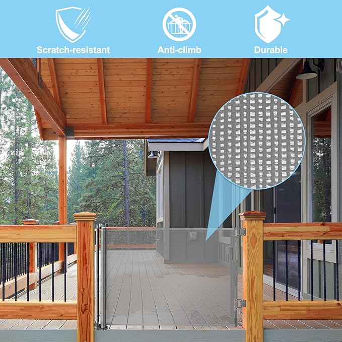 - Durable Scratch-resistant Mesh:The mesh of the extra wide child gate is made of soft and durable scratch-resistant mesh, which not only won't bump your child but also can resist pet's claws.