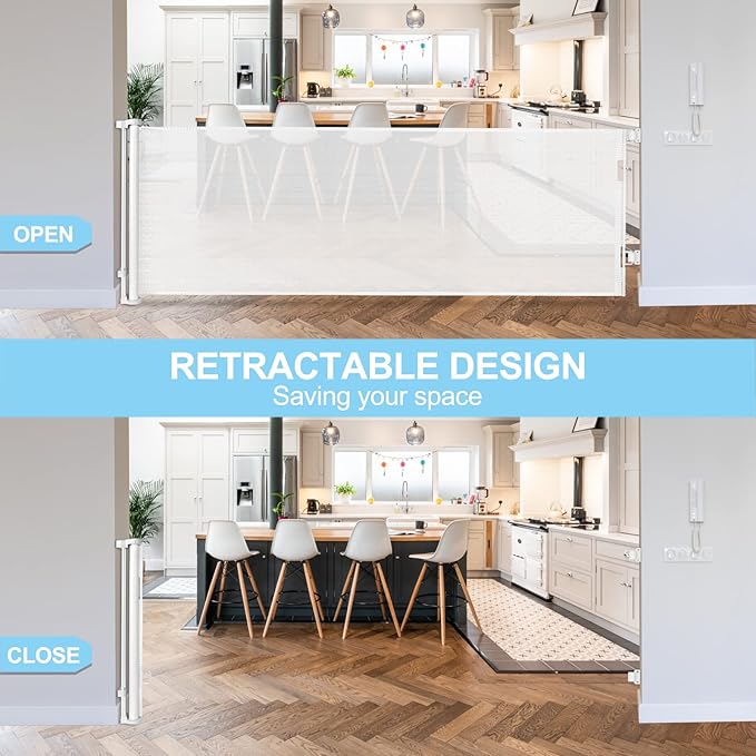 - Retractable Gate-Saving Your Space: The extra long baby gate is retractable, the mesh can be rolled up when not in use, not taking up your space, and when there is a party in the house, easy for your friends to pass through.