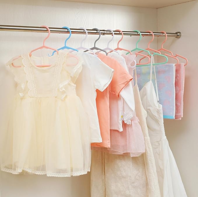 - [Multi-colors baby hangers]:Plastic baby hangers come in 6 colors. 50 pack kids hangers fit for childrens clothes baby infant toddler newborn nursery, perfect for all your nursery and storage organization needs.Offering better organization and harmony to your space,and makes the wardrobe more tidy.