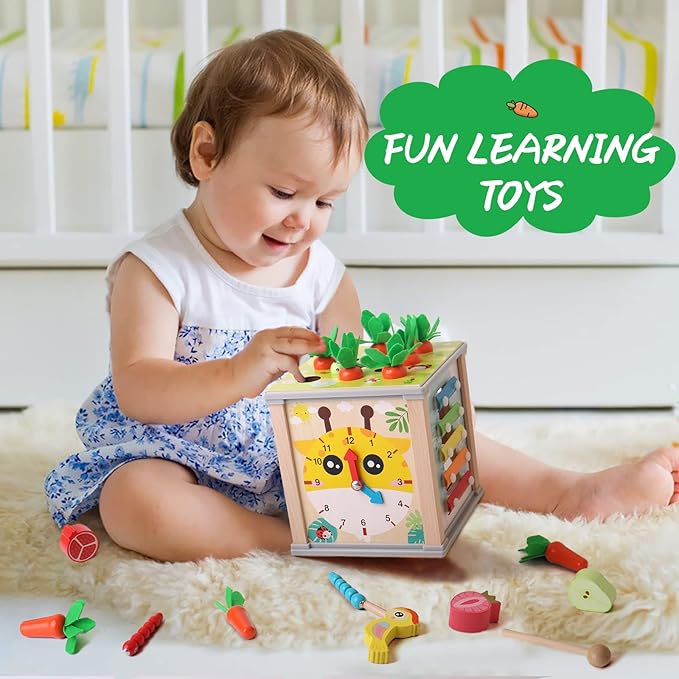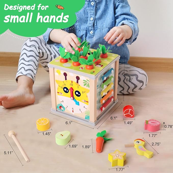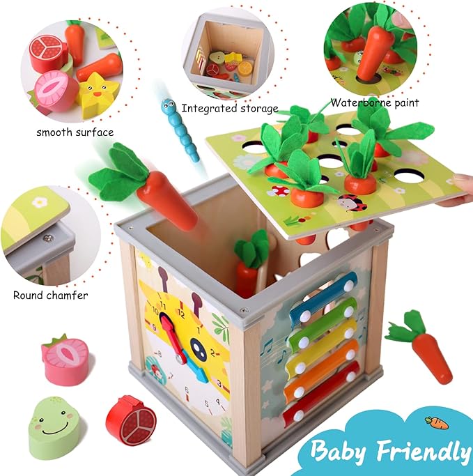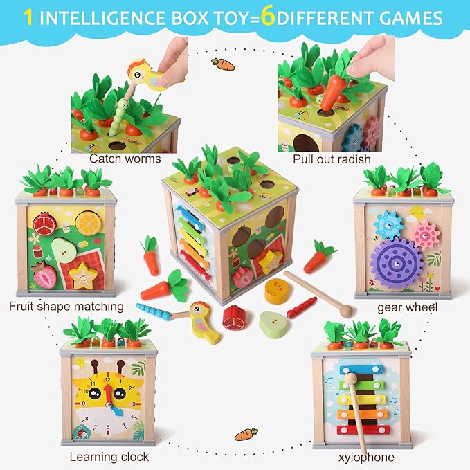 - 6 in 1 Multifunctional Montessori Toy Set: This multifunctional activity cube allows your child to play 6 games in one toy: carrot harvesting game, bug catching, xylophone, spinning gears, shape fruit awareness, and learning clock. Your child will have a lot of fun playing these games.