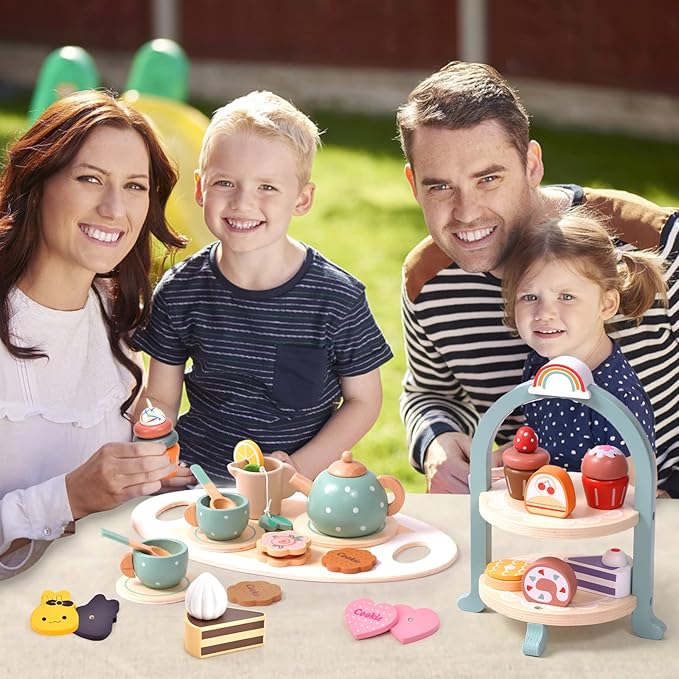 - Fun Kids Tea Party Time: Your little kid gets ready to spend happy teatime with friends and family, dessert, drinks, and talk! Lay out the tablecloth, fill the dessert tower and tray with a delicious dessert, put the tea or coffee in the cup, and start tea time! The realistic wooden tea set will bring screen-free fun and leave unforgettable memories for children