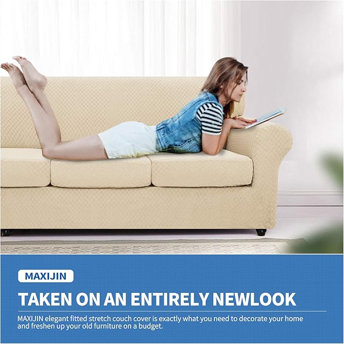 - HIGH STRETCHY - MAXIJIN fitted sofa slipcovers are made of high quality 85% polyester and 15% spandex fabric, which is soft in texture, comfortable in feeling and with good breathability. Due to its high stretchable feature, our magic couch cover is more flexible to be applied to various couches,such as t-cushion couches, box cushion couches, high back couches, small and extra large leather couches. Improved thick cloth is more durable and wear resistant