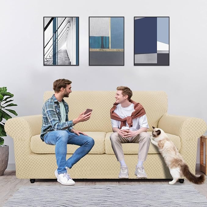 MAXIJIN 3 Piece Stretch Couch Covers for 2 Cushion Couch Sofa Slipcovers with 2 Extra Large Seat Cushion Couch Jacquard Loveseat Sofa Couch Cover for Dogs (2 Cushion Sofa, Light Beige)