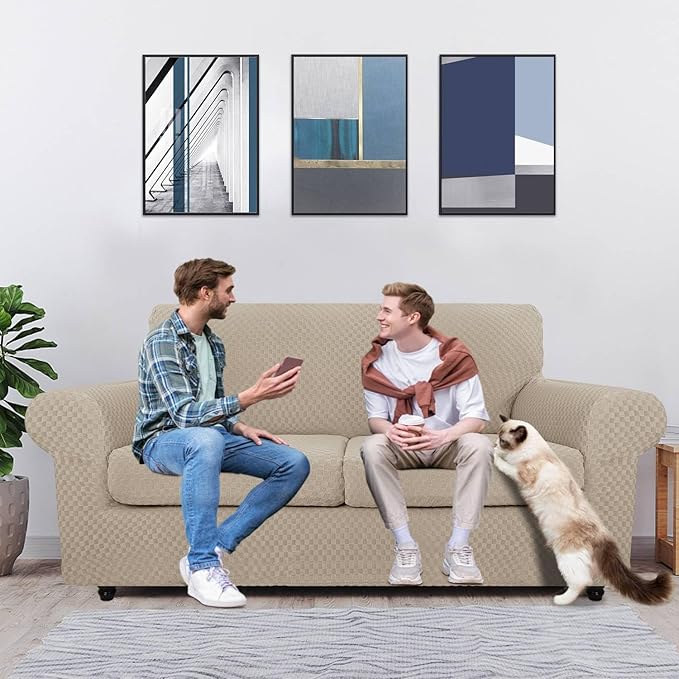 MAXIJIN 3 Piece Stretch Couch Covers for 2 Cushion Couch Sofa Slipcovers with 2 Extra Large Seat Cushion Couch Jacquard Loveseat Sofa Couch Cover for Dogs (2 Cushion Sofa, Khaki)