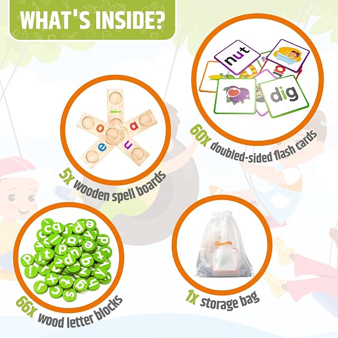 - đĽă131-PIECE WODDEN SPELLING GAMEăComes with 66 pcs of wooden lowercase letter blocks, 60 CVC phonics word flashcards with picture illustrations, 5wooden spell boards in palm-size, and 1draw-string portable bag. More than 60 combinations of 3-letter-word, Fun learning toys for 3-5 year olds.