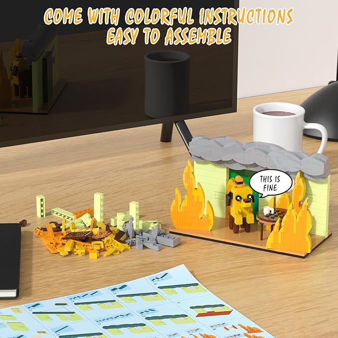 - Fine! This is Fine: The image of a dog drinking coffee in a burning house, in a smoky environment, is enough to make you smile. As you begin to build the blocks, each one is like a little surprise, and the gradual process of recreating this strange scene is full of joy