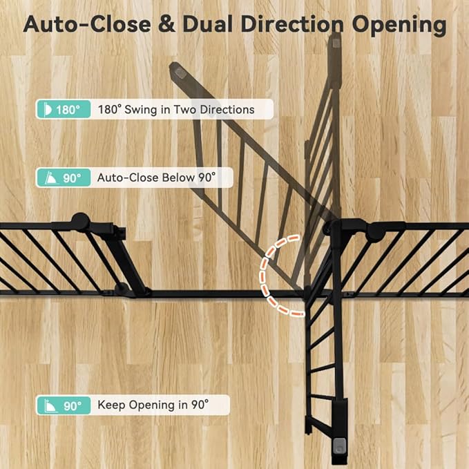 - Auto Locking & Double Safety: Our baby gate features a double-locking mechanism that locks both at the top and bottom. Simply press the button and lift it with one hand to unlock. It's easy for adults but challenging for children and pets. The dog gate automatically closes when the opening angle is less than 90°, and the door can swing in dual directions