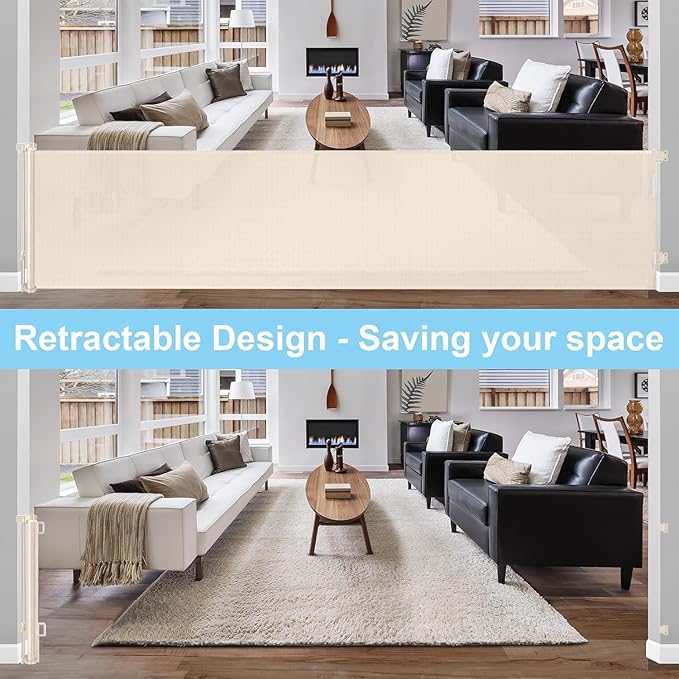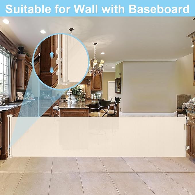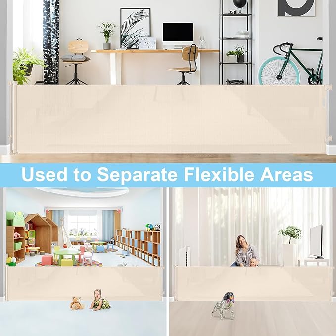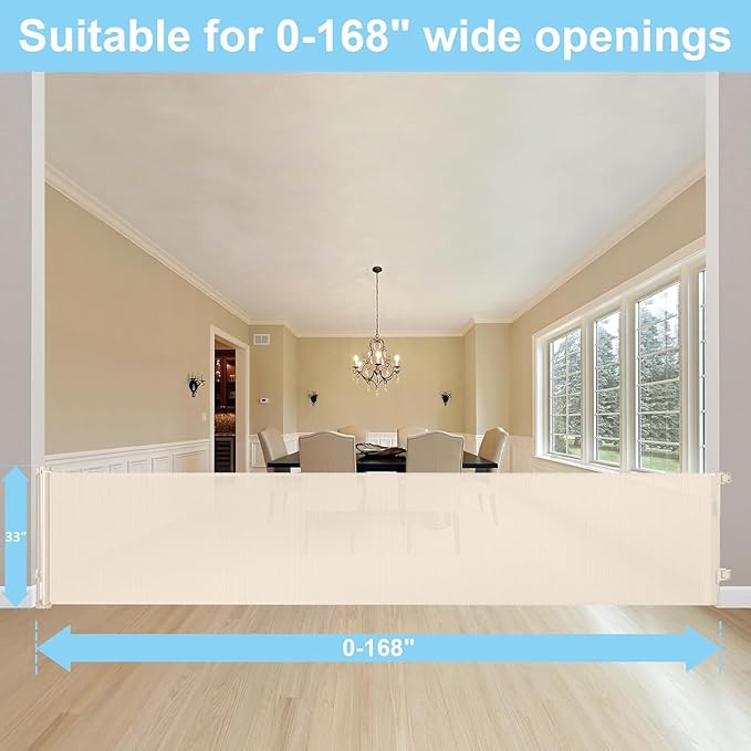 - [168" Extra Wide & Retractable Design] Extra wide retractable baby gates can be extended up to 168 inches wide and 33 inches tall. (inner size:168" wide,full size:168" wide). Mesh can be completely retracted away when not in use.