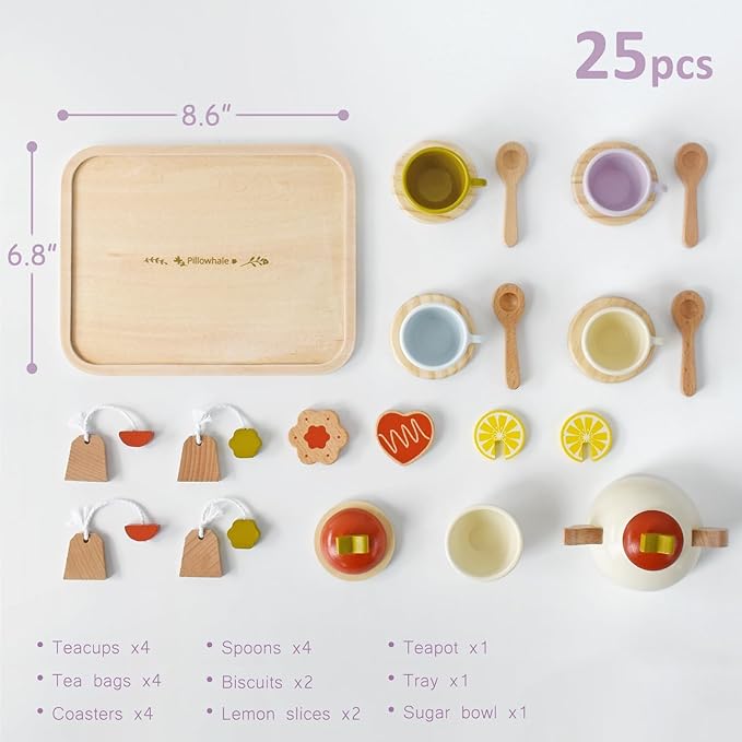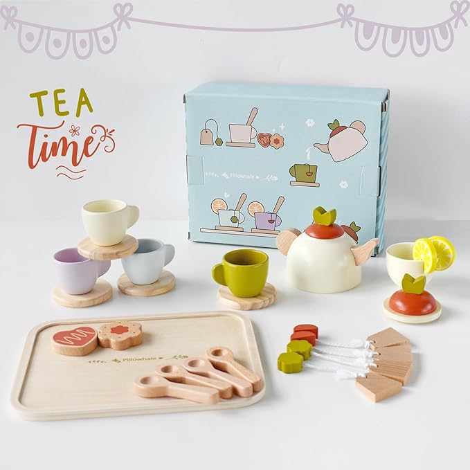 • [Wooden Tea Set Details] The Pillowhale kids tea cup set simulates the adult afternoon tea experience, providing a 4-serve tea set ideal for fostering social skills during pretend tea parties with friends and family. It provides a wonderful opportunity for parents to engage in their child's world.