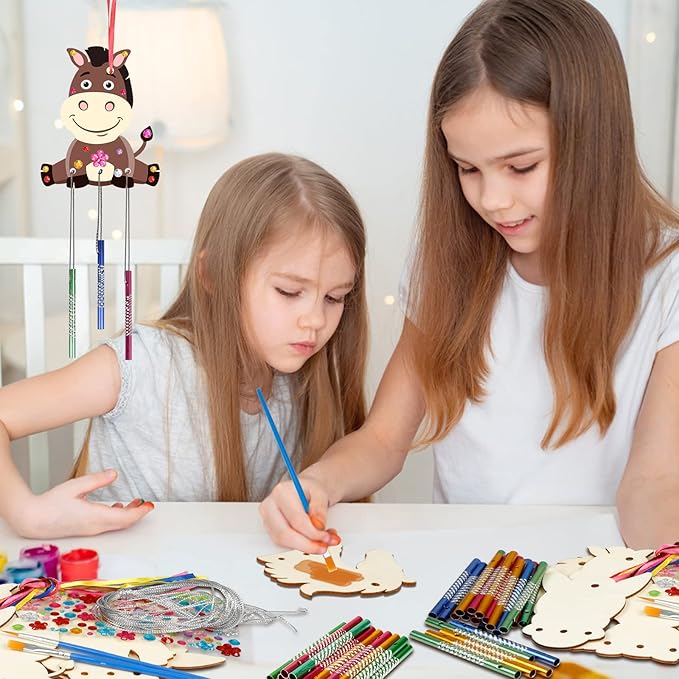 - Wind Chime Kit:the DIY wooden wind chimes kit for kids include 8 x wooden horse head(4 designs,each of 2),24x wind chime tubes(4 colors, 6 for each color),2x paiting brushes(there no paint included),8x 1M silver wire,8 x color rope,1x rhinestone stickers.Sufficient quantity and various styles to meet your decorative needs,kids can make their own wind chime kit.