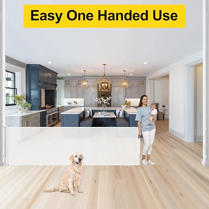 - [Easy to Use with One Hand]The extra long retractable pet gate is designed with a double locking system. Adults can easily lock and unlock the child gates, but children cannot.