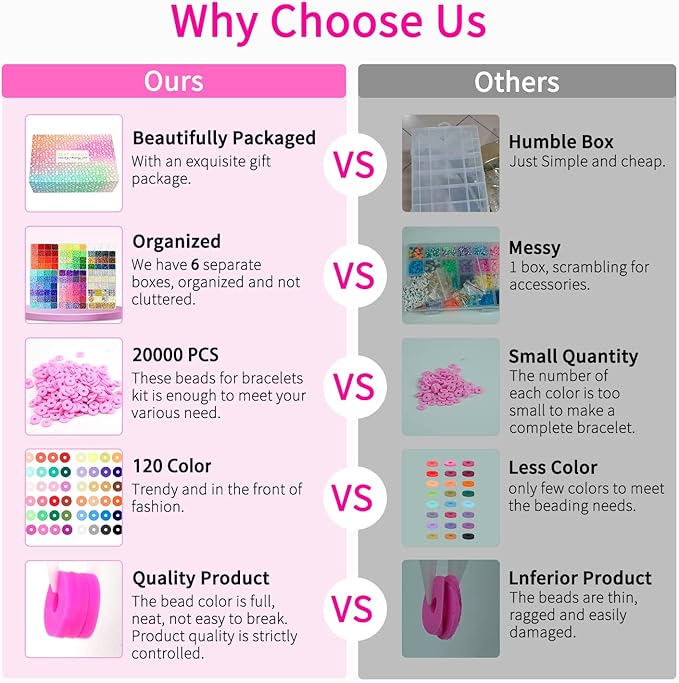 - EVERYTHING YOU NEED INCLUDE, WELL ORGANIZED IN 6 BOXES - The Clay beads bracelet making kit contains 19,000pcs clay beads in 120 different colors and 1000+ accessories. The rich accessories include letter beads, heart beads, evil eyes beads, smile face beads, square beads, star beads, pendants and charms, lobster clasps, etc. More than ten kinds of accessories to make your design more exciting. (Everything shown on the picture contains)