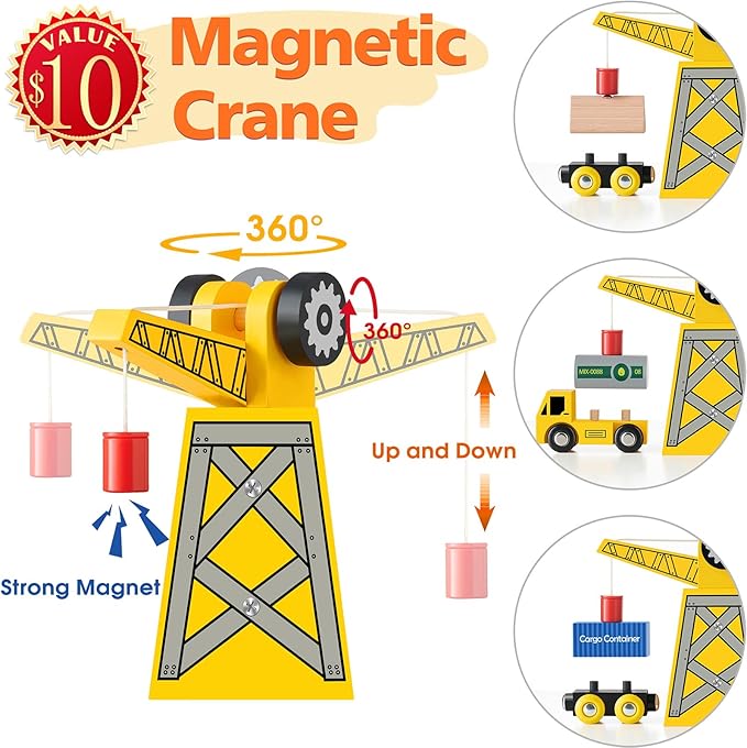 - Crane Design: The wooden train set includes a crane that can lift and transport cargo, which adds an extra level of engagement and extends playtime for children.