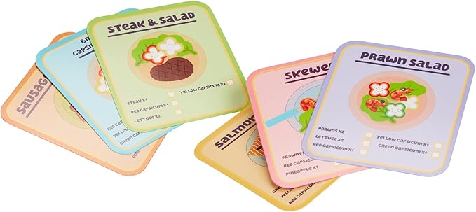 - GRILL GRIN – Whether your little chef is cooking up a delicious Sausage Sizzle or a healthy Prawn Salad, the 6 recipe cards make it easy to follow the ingredients included in each dish and provides a fun matching game.