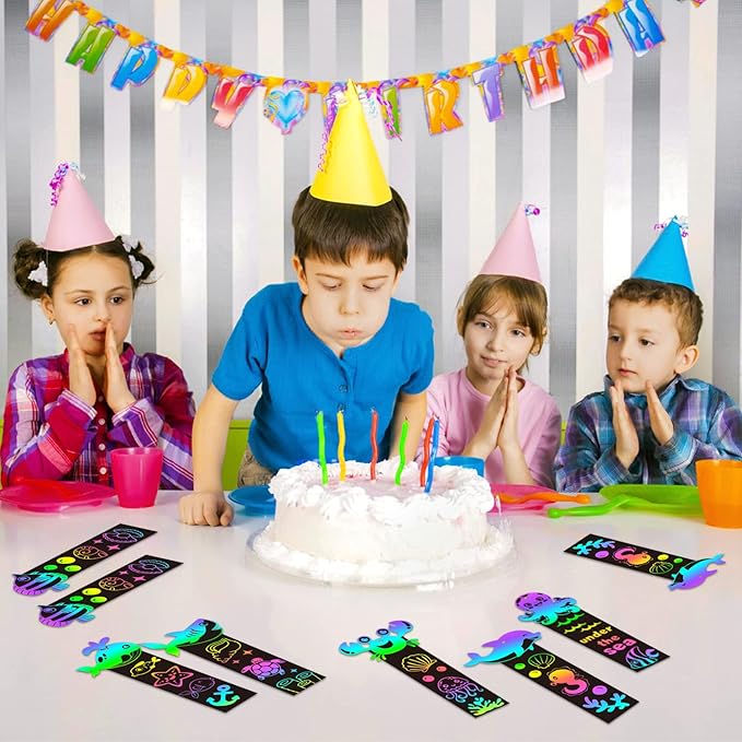 - PACKAGE CONTENT: 60 pcs scratch art bookmarks, including 6 sea animal shapes and each has 10 pcs. 20 pcs scratch paper stylus wood sticks, 1 roll of ribbons in blue. This easy craft project is perfect for kids of 3 years and up.
