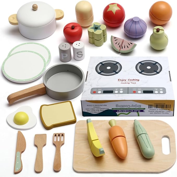 • CHECK THE GAS STOVE ON THE BOX: wood cutting food toy comes with gas stove on the back of the box. Cook your vegetables and fruits dishes in wooden pot and pan on our cute little stove, turn it on, stir and be careful not to overcook it :)