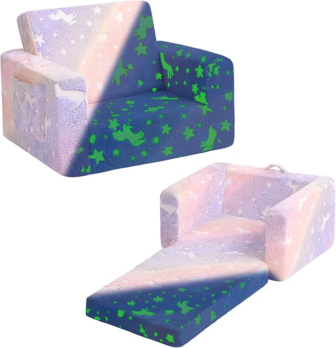 - 【Cartoon Pattern and Suitable for Any Environment】: The children's couch has a childlike pattern and emits light at night, just put the kids' sofa under bright lights or sunlight for 15-30 minutes. Whether it's placed in a living room, playroom, or bedroom, it blends seamlessly with the surroundings.