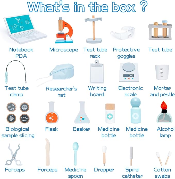 - The kit includes a machine washable lab researcher's hat, kids science goggles, droppers, name tag, test tubes, spoon, tweezers, wooden beakers, notebook PDA, microscope, biological sample slicer, toy electronic scale, and writing board for kids.