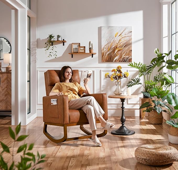 Yaheetech Rocking Chair, Leather Nursery Glider Chair, Upholstered Accent Chair with Rubber Wood Legs and Side Pockets, High Back Armchair for Living Room, Bedroom, Brown