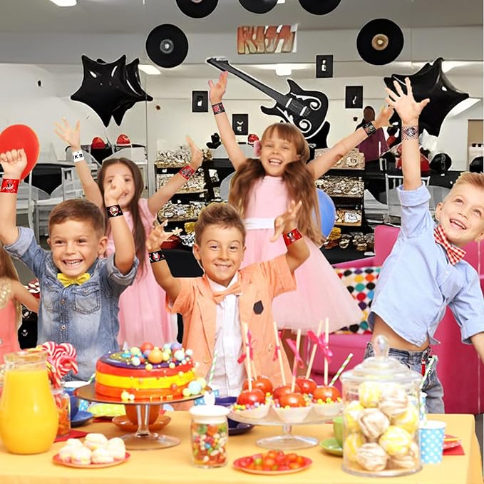 - Rock and Roll Party Decorations: Born to rock! You will get 48pcs slap bracelets in 12 designs, features an assortment of rock elements ,vinyl record ,pirate decor ,blow up guitar ,piano, drum set, microphone, Various rock and other cool styles patterns will make your party very memorable
