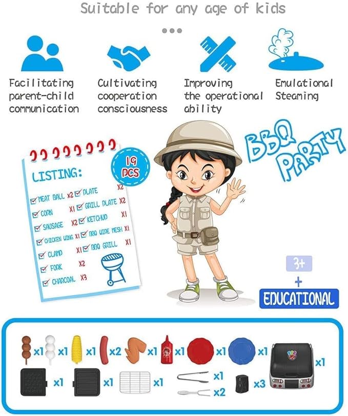 - A GREAT GIFT IDEA FOR KIDS – Whether it’s an Easter basket stuffer or birthday gift idea for boys & girls ages 3-8 years old; this Kids Play Food Grill with Pretend Smoke Sound Light Kitchen Playset BBQ Accessories Camping Toy Cooking Set is sure to bring hours of fun!