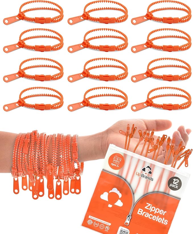 - How many fidget toys come in the pack? The pack includes a total of 12 UpBrands orange zipper bracelets, each measuring 7 inches. These vibrant, single-color bracelets are perfect for sharing, group activities, or ensuring you always have a fun and practical sensory toy on hand. Their bold orange color and engaging design make them ideal for kids and adults alike, providing a playful and enjoyable sensory experience for everyone.